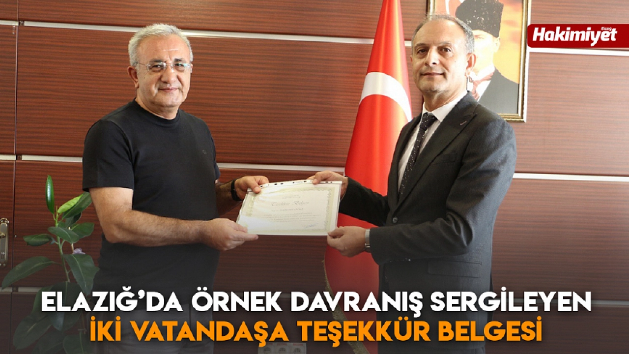 Elazığ'da örnek davranış sergileyen iki vatandaşa teşekkür belgesi