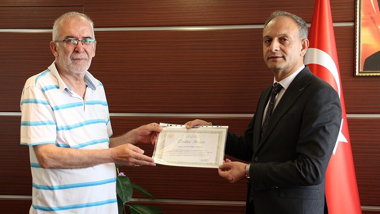 Elazığ'da 3-9 Eylül Halk Sağlığı Haftası kapsamında düzenlenen etkinliklerde sigarayı bırakan iki vatandaşa Elazığ İl Sağlık Müdürü Dr. Emrah Gecekuşu tarafından 'Teşekkür Belgesi' takdim edildi.