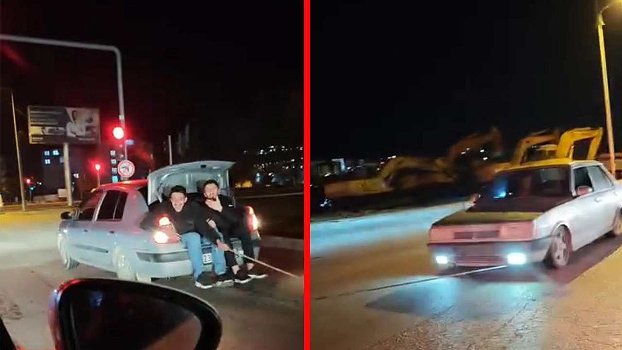Sanayi Mahallesi'nde arızalanan TOFAŞ Doğan'ı çekmek için bir aracın bagajına oturan 2 kişi, hem kendi canlarını hem de trafikteki diğer sürücüleri tehlikeye attı.
