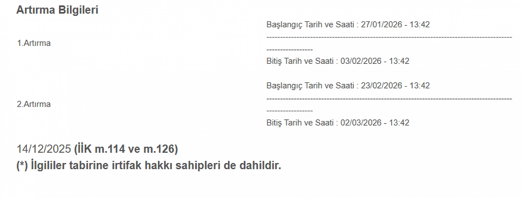 İkinci artırma: 23 Şubat 2026 saat 13.42’de başlayacak, 2 Mart 2026 saat 13.42’de tamamlanacak.