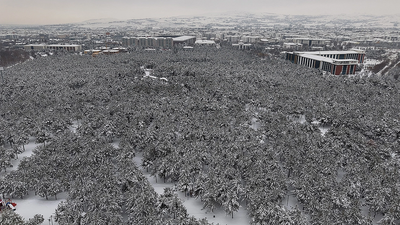 Kar yağışı sonrası oluşan manzaralar bu kez yüksek rakımlı dağlardan değil, Elazığ’ın merkezinden kaydedildi. Beton binalar ve ana arterlerle çevrili Fırat Üniversitesi kampüsü içerisindeki ormanlık alan, karla birlikte şehir merkezinde dev bir kış bahçesi görünümü kazandı.