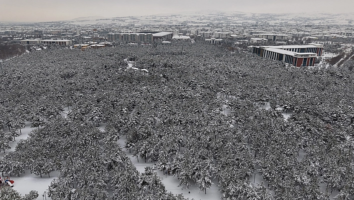 Elazığ'da etkili olan kar yağışının ardından, şehrin kalbinde yer alan Fırat Üniversitesi ormanı ve Kültür Park, beyaz örtüyle kaplanarak adeta bir kış vahasına dönüştü.