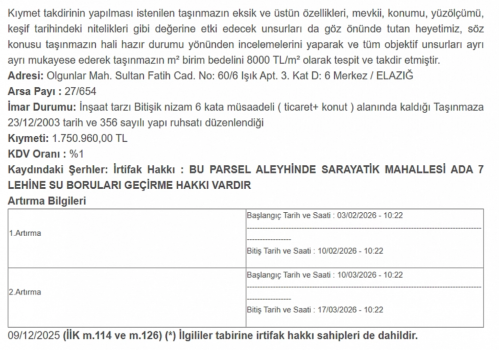 Elazığ merkez Sürsürü Mahallesi Çayağzı Mevkii'nde bulunan 3+1, 85 metrekarelik daire, 1 milyon 750 bin 960 TL muhammen bedelle icra yoluyla satışa çıkarıldı açık artırma süreci Şubat 2026'da başlayacak. İşte söz konusu satışla ilgili detaylar…