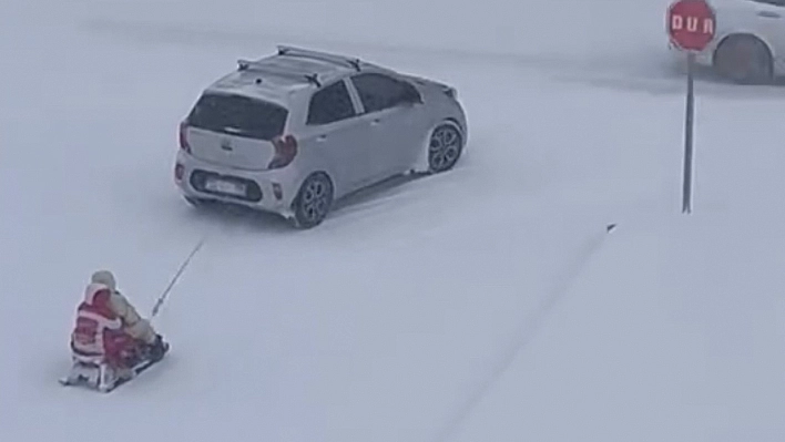 Kent genelinde kar yağışı nedeniyle hayat zaman zaman durma noktasına gelirken, bazı vatandaşlar durumu eğlenceye çevirmeye çalıştı. Bir aracın arkasına bağlanan kızak, trafikte çekildi. Kızağın üzerinde bulunan iki kişi, kayan kızakla eğlendi.