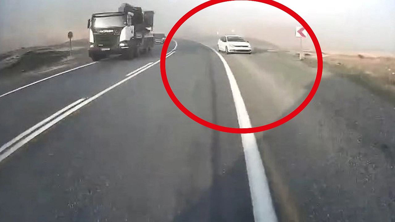 Araç kamerasına yansıyan görüntülerde, hem otomobil sürücüsünün hem de karşı yönden gelen kamyon sürücüsünün ani fren yaparak muhtemel bir facianın önüne geçtiği görüldü.