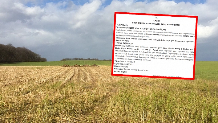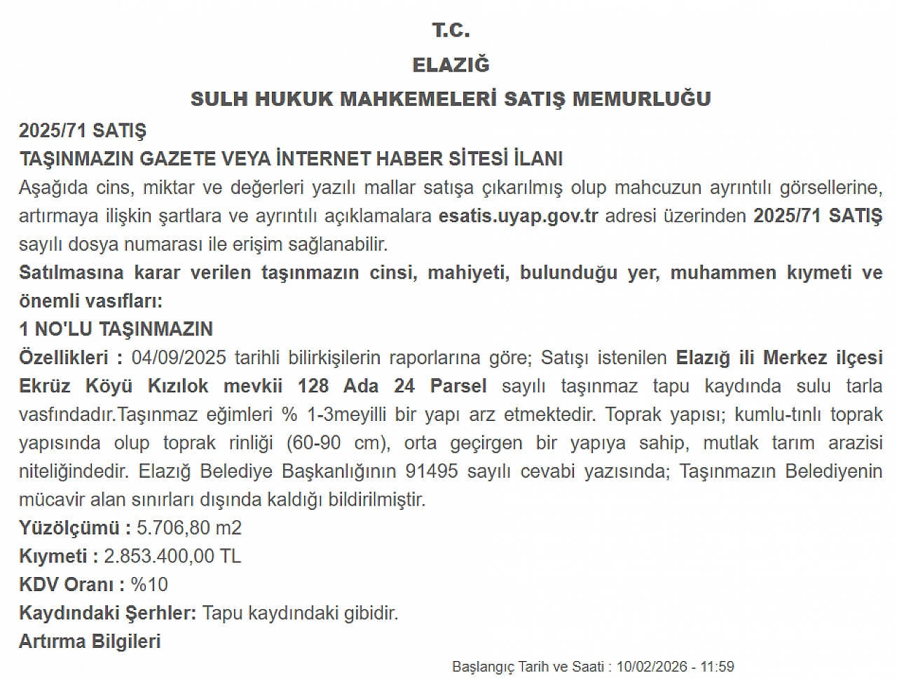 Elazığ Merkez ilçesinde bulunan 5.706 metrekare büyüklüğündeki tarla, mahkeme kararıyla icra yoluyla satışa sunuldu. Satış işlemi, Elazığ Sulh Hukuk Mahkemeleri Satış Memurluğu tarafından yürütülüyor.