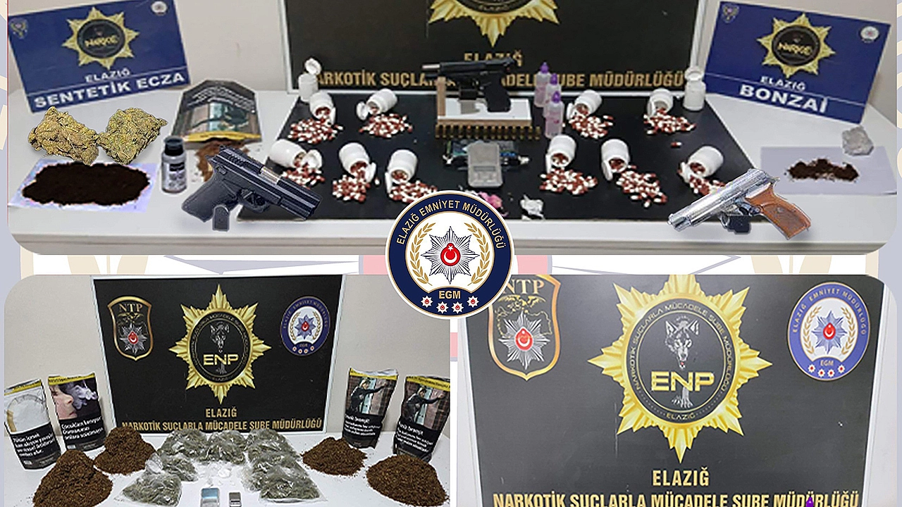 Elazığ Cumhuriyet Başsavcılığı koordinesinde İl Emniyet Müdürlüğü Narkotik Suçlarla Mücadele ve Asayiş Şube Müdürlüğü tarafından uyuşturucu ile mücadele çalışmaları sürüyor. Bu çerçevede son bir ay içerisinde uyuşturucu madde kullanan ve uyuşturucu madde ticareti yapan şahıslara yönelik yapılan operasyonlarda; 67 parça halinde 2 kilo 921 gram sentetik kannabinoid maddesi, 14 parça halinde 1 kilo 990 gram metamfetamin maddesi, 17 parça halinde 1 kilo 175 gram esrar maddesi, 7 parça halinde 79,83 gram kokain maddesi, 1140 adet sentetik ecza maddesi, 5 adet hassas terazi, 4 adet ruhsatsız tabanca ve tabancalara ait 54 adet fişek ele geçirildi.