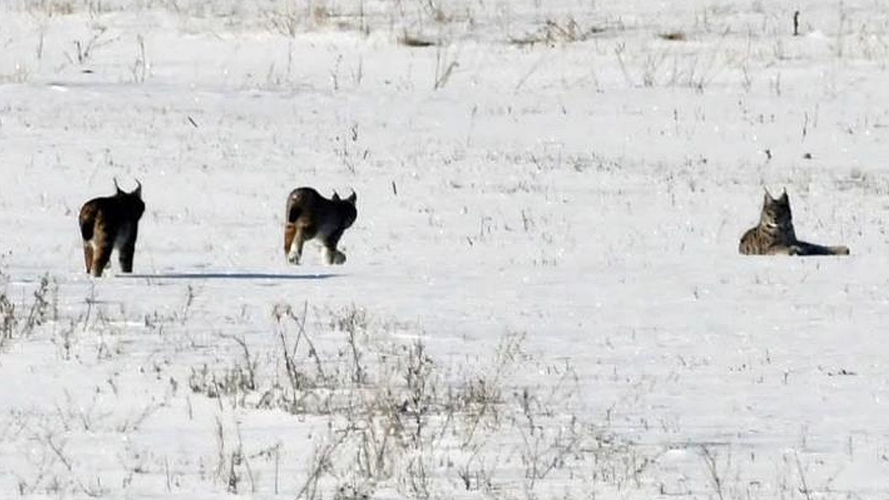 Bölgede etkili olan kar yağışı sonrası doğada yiyecek bulmakta zorlanan vaşak ailesinin köy kırsalına kadar indiği görüldü. Bir süre kar üzerinde ilerleyen vaşaklar, daha sonra gözden kayboldu.