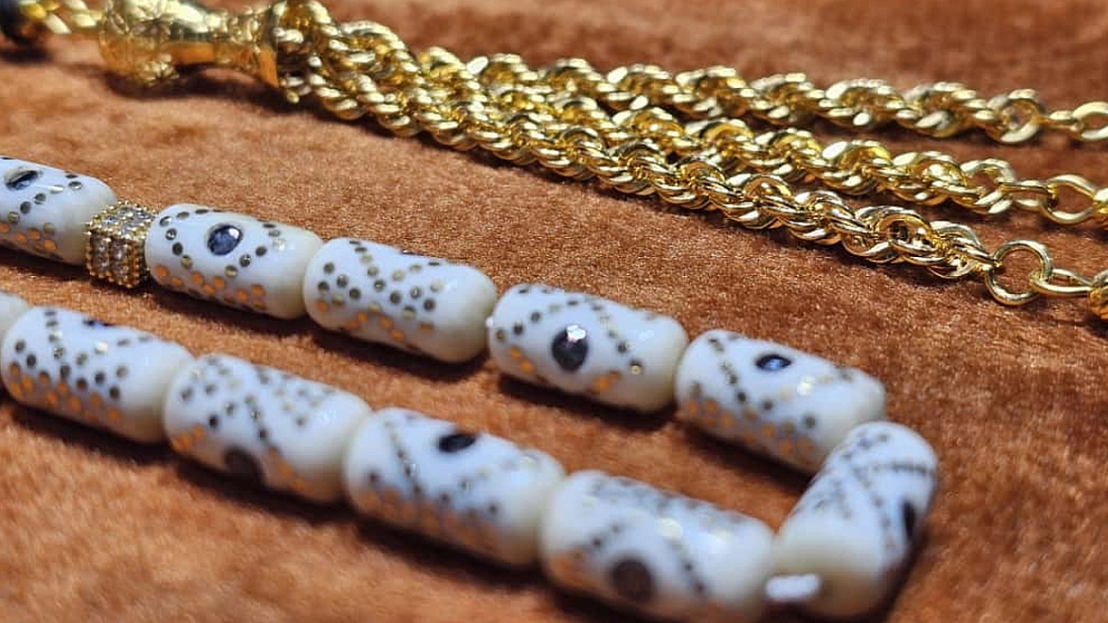 Elazığ'da ilk defa sipariş üzerine yapılan ve pırlanta işlemeli altın püsküllü fil dişi tespih 3 ay boyunca yapılan çalışmaların tamamlanmasının ardından görücüye çıktı.