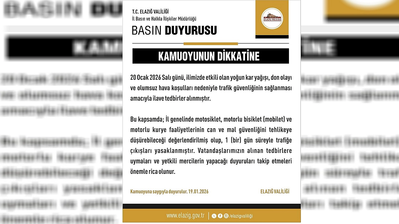 Elazığ Valiliğinden yapılan açıklamada, "20 Ocak 2026 Salı günü ilimizde etkili olan yoğun kar yağışı, don olayı ve olumsuz hava şartları nedeniyle trafik güvenliğinin sağlanması amacıyla ilave tedbirler alınmıştır. Bu kapsamda il genelinde motosiklet, motorlu bisiklet (mobilet) ve motorlu kurye faaliyetlerinin can ve mal güvenliğini tehlikeye düşürebileceği değerlendirilmiş olup, 1 gün süreyle trafiğe çıkışları yasaklanmıştır. Vatandaşlarımızın alınan tedbirlere uymaları ve yetkili mercilerin yapacağı duyuruları takip etmeleri önemle rica olunur" ifadelerine yer verildi.