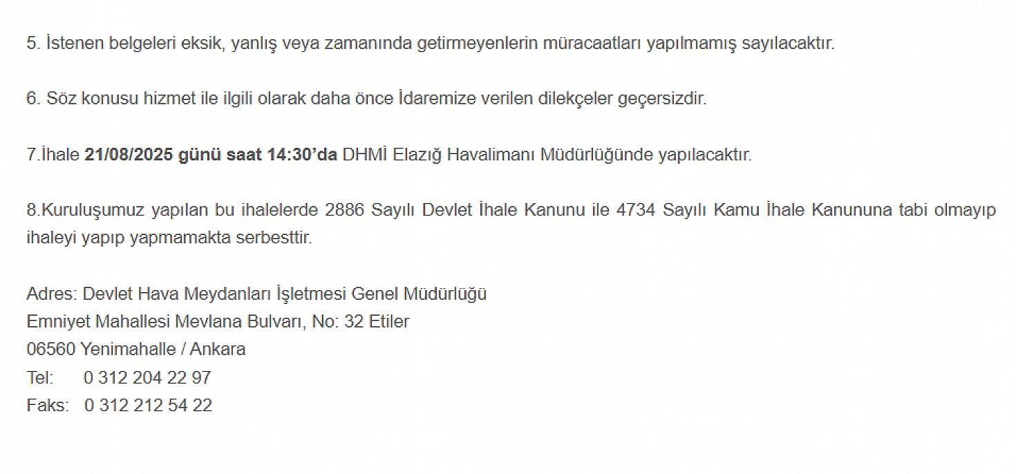 İhaleye katılmak isteyenlerin, gerekli belgeleri 21 Ağustos 2025 günü saat 14.00’e kadar DHMİ Elazığ Havalimanı Müdürlüğü Evrak Birimi’ne teslim etmeleri gerekiyor. Belirtilen tarih ve saatten sonra yapılan başvurular kabul edilmeyecek.