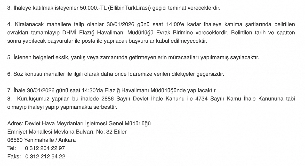 Başvurular, 30 Ocak 2026 Cuma günü saat 14.00’e kadar DHMİ Elazığ Havalimanı Müdürlüğü Evrak Birimi’ne yapılacak. Bu saatten sonra ya da posta yoluyla yapılacak başvurular kabul edilmeyecek. İhale ise aynı gün saat 14.30’da Elazığ Havalimanı Müdürlüğü’nde gerçekleştirilecek.