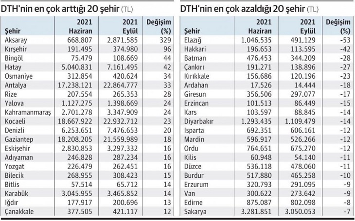 Türkiye’nin 81 ilinde tasarruf mevduatı amacıyla bankalarda tutulan döviz hesaplarında bu dönemde 61 milyar TL’lik artış gerçekleşti. İller bazında bakıldığında ise oransal olarak en yüksek DTH artışı sırasıyla Aksaray, Kırşehir, Bingöl, Hatay, Osmaniye, Antalya, Rize, Yalova, Kahramanmaraş ve Kocaeli’de gerçekleşti. Aynı dönemde en çok döviz bozduran şehirler olarak Elazığ, Hakkari, Batman, Çankırı, Kırıkkale, Ardahan, Giresun, Erzincan, Kars ve Diyarbakır oldu.