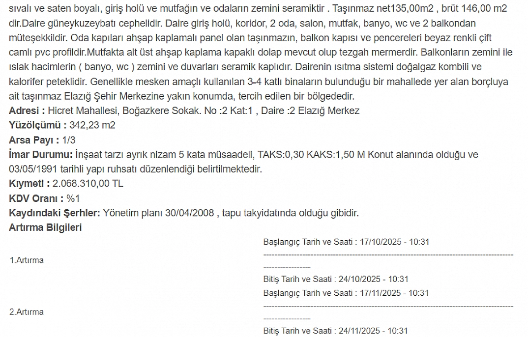 Satış için iki ayrı açık artırma düzenlenecek. İlk artırma 17 Ekim 2025 tarihinde saat 10.31’de başlayacak ve 24 Ekim 2025 saat 10.31’de sona erecek. İkinci artırma ise 17 Kasım 2025 tarihinde başlayacak ve 24 Kasım 2025’te sona erecek. Katılımcılar, satışla ilgili tüm detaylara ve görsellere esatis.uyap.gov.tr adresinden “2025/1421 Esas” dosya numarasıyla ulaşabilecek.