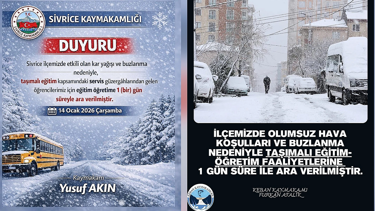 Keban Kaymakamlığından yapılan açıklamada ise, "İlçemizde olumsuz hava şartlarını ve buzlanma nedeniyle taşımalı eğitim-öğretim faaliyetlerine 1 gün süre ile ara verilmiştir" ifadelerine yer verildi.