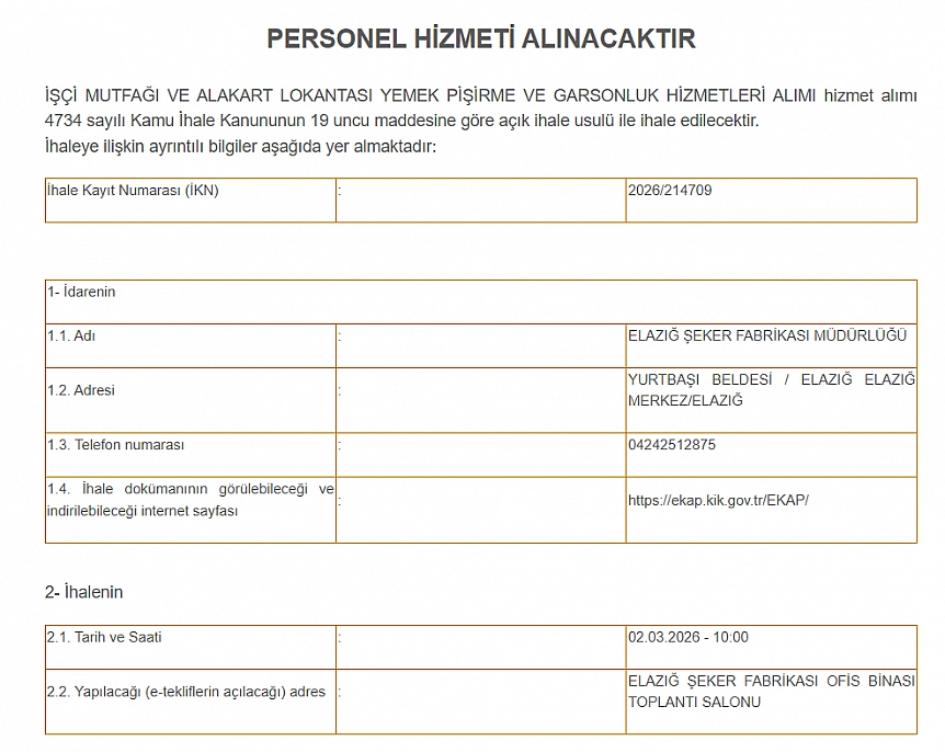 - Elazığ Şeker Fabrikası personel alımı için ihaleye çıktı! 19 personel 12 ay süreyle görevlendirilecek