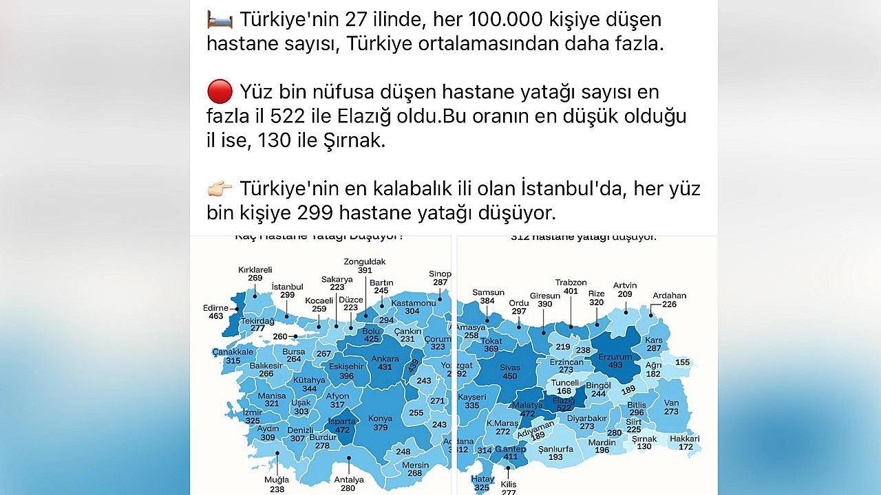 Türkiye genelinde yapılan değerlendirmeye göre, yüz bin nüfusa düşen hastane yatağı sayısında Elazığ zirvede yer aldı.