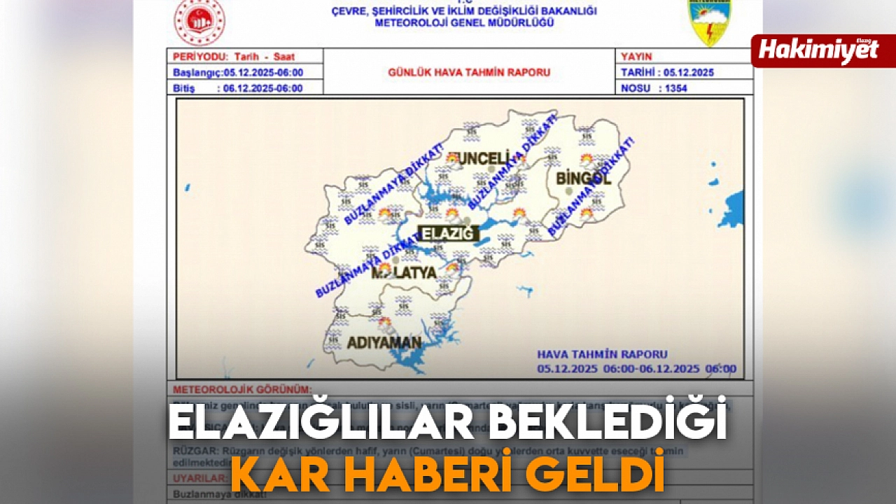 Meteoroloji 13. Bölge Müdürlüğü, Elazığ için hafta sonu yağış uyarısında bulundu. Yapılan açıklamada, bölge genelinde havanın parçalı bulutlu ve sisli olacağı, cumartesi günü ise yağmur, karla karışık yağmur ve kar yağışının etkili olmasının beklendiği bildirildi.