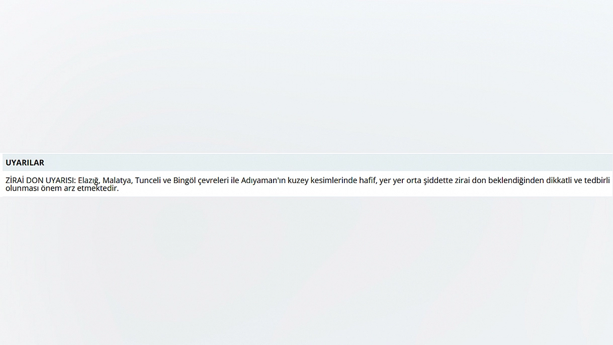 Haberler Yaşam Elazığlılar dikkat! Meteoroloji'den bu uyarı size geldi Elazığlılar dikkat! Meteoroloji'den bu uyarı size geldi Meteoroloji Genel Müdürlüğü, Elazığ ve çevre illere zirai don uyarısında bulundu. PAYLAŞ 08.11.2025 13:17 Güncelleme: 08.11.2025 13:17 Ayşe ORZANMuhabir TAKİP ET 4 4 PAYLAŞ Görsel - 4 : Elazığlılar dikkat! Meteoroloji'den bu uyarı size geldi