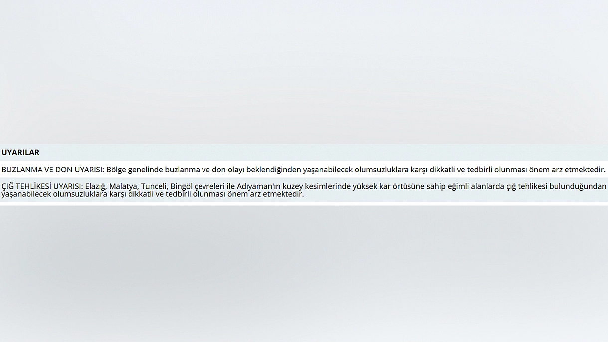 Haberler Yaşam Elazığlılar dikkat! Meteoroloji'den kritik uyarı yapıldı Elazığlılar dikkat! Meteoroloji'den kritik uyarı yapıldı Meteoroloji'den Elazığ ve çevre illere uyarı geldi. PAYLAŞ 29.01.2026 13:38 Güncelleme: 29.01.2026 13:38 Ayşe ORZANMuhabir TAKİP ET 4 4 PAYLAŞ Görsel - 4 : Elazığlılar dikkat! Meteoroloji'den kritik uyarı yapıldı