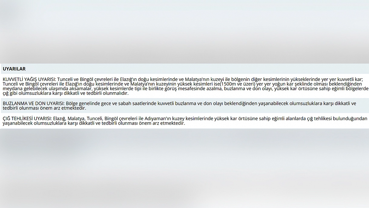 Elazığ'ın doğu ve yüksek kesimlerinde yoğun kar yağışı, buzlanma ve çığ riski bekleniyor. Vatandaşların ve sürücülerin tedbirli olması gerekiyor.