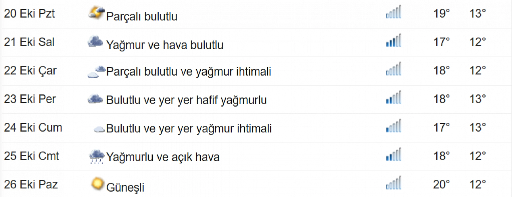 20 Ekim Pazartesi günü parçalı bulutlu hava koşulları etkili olacak. Hava sıcaklığı en yüksek 19 derece, en düşük 13 derece olarak ölçülmesi bekleniyor.