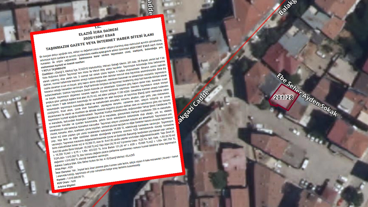 Elazığ Merkez İcadiye Mahallesi’nde bulunan 20 metrekarelik dükkan, icra yoluyla satışa çıkarıldı. Muhammen bedeli 1 milyon 15 bin TL olarak belirlenen taşınmaz için mart ve nisan aylarında iki ayrı artırma yapılacak. Elazığ Merkez’e bağlı İcadiye Mahallesi’nde yer alan bir dükkan, borçtan dolayı Elazığ 1. İcra Dairesi tarafından icra yoluyla satışa sunuldu. Helvacı Sokağı mevkiinde bulunan taşınmaz, zemin katta yer alıyor ve halihazırda dükkan olarak kullanılıyor.