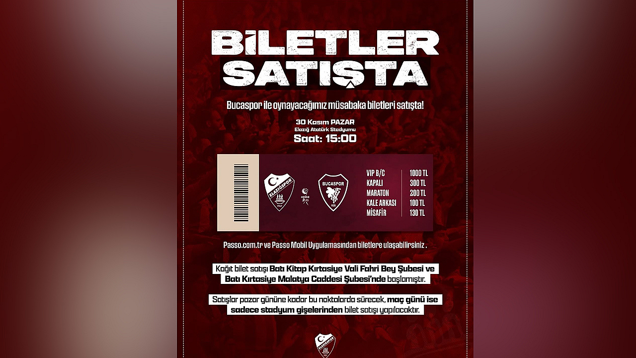 Seza Çimento Elazığspor'un 30 Kasım Pazar günü Bucaspor 1928 ile oynayacağı karşılaşmanın biletleri satışa çıktı.