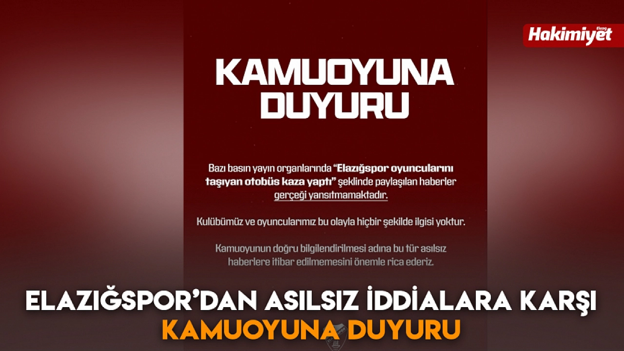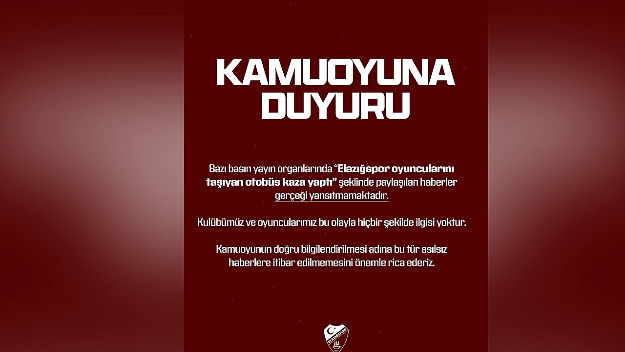 Elazığspor Kulübü, sosyal medya hesabı üzerinden yaptığı açıklamayla bazı basın organlarında yer alan 'Elazığspor oyuncularını taşıyan otobüs kaza yaptı' iddialarını kesin bir dille yalanladı.
