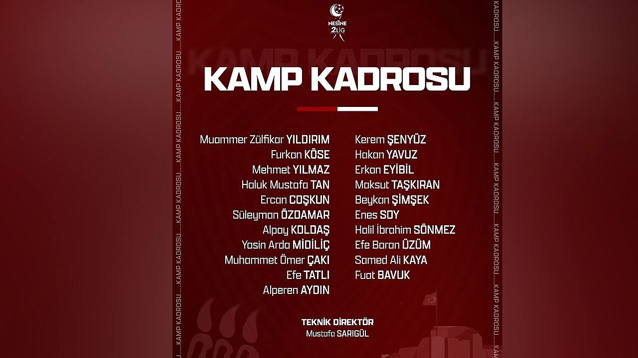 Muammer Zülfikar Yıldırım, Furkan Köse, Mehmet Yılmaz, Haluk Mustafa Tan, Ercan Coşkun, Süleyman Özdamar, Alpay Koldaş, Yasin Arda Midilçi, Muhammet Ömer Çakı, Efe Tatlı, Alperen Aydın, Kerem Şenyüz, Hakan Yavuz, Erkan Eyibil, Maksut Taşkıran, Beykan Şimşek, Enes Soy, Halil İbrahim Sönmez, Efe Baran Üzüm, Samed Ali Kaya, Fuat Bavuk.