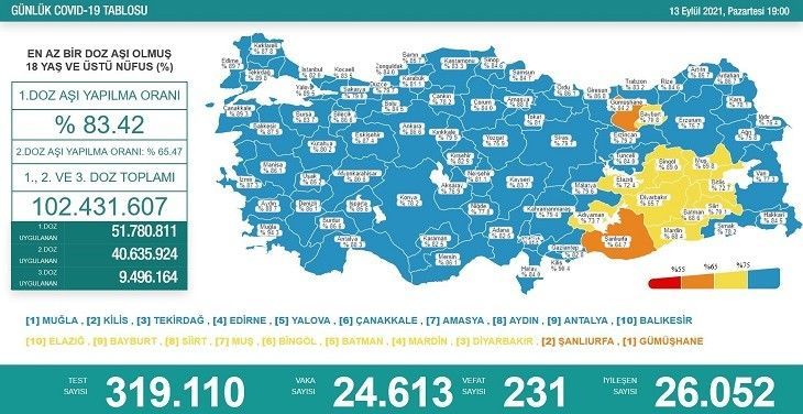 Sağlık Bakanlığı tarafından Türkiye'nin yeni korona virüs tablosu açıklandı. 13 Eylül’de açıklanan 24 saatlik verilere göre 24 bin 613 vaka tespit edildi. Virüs nedeniyle hayatını kaybedenlerin sayısı 231 oldu. Bir günde toplam 319 bin 110 test yapılırken, iyileşen hasta sayısı 26 bin 52 olarak kaydedildi. Sağlık Bakanlığı tarafından açıklanan tabloda, aşılama verilerine de yer verildi. En az 1 doz aşı olmuş 18 yaş üzeri nüfusu kapsayan verilere göre Türkiye'de 1. doz aşılama ortalama yüzde 83,42 oldu. 2. doz ortalaması yüzde 65,47 olurken, 1., 2. ve 3. doz aşısını olan vatandaş sayısı toplamda 102 milyon 431 bin 607’e yükseldi.
