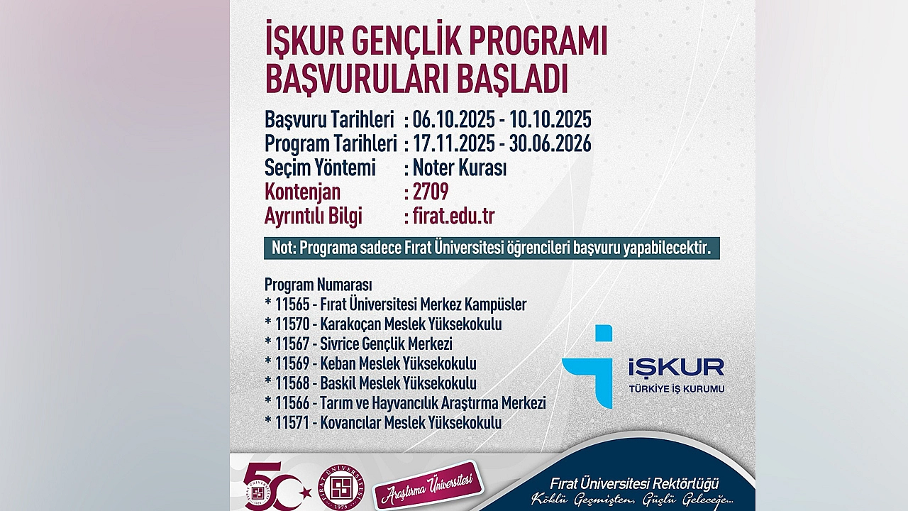 Fırat Üniversitesi öğrencilerine hem gelir elde etme hem de iş deneyimi kazanma imkânı sunan İŞKUR Gençlik Programı, 2025–2026 dönemi için yeniden başlıyor. Başvurular 6–10 Ekim 2025 tarihleri arasında alınacak. Programa yalnızca Fırat Üniversitesi öğrencileri başvuru yapabilecek.
