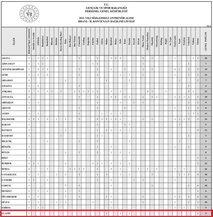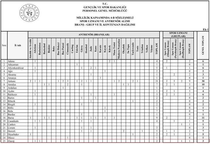 Yayımlanan ilanda Millilik Kapsamında 4-B Sözleşmeli Spor Uzmanı ve Antrenör Alımı Branş-Grup ve İl Konten Dağılımına ilişkin bilgilere de yer verildi. Yayımlanan kontenjan dağılım tablosunda Elazığ'da Millilik kapsamında 1 Atletizm, 1 Badminton antrenörü ve deaflimpik branşında 1 spor uzmanı olmak üzere 3 kontenjan ayrıldığı görüldü.