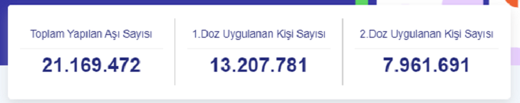 Türkiye geneli toplam aşılanan kişi sayısı 21 milyon 169 bin 472oldu. Birinci dozu olanların sayısı 13 milyon 207 bin 781, ikinci dozu olanların sayısı ise 7 milyon 961 bin 691 oldu.