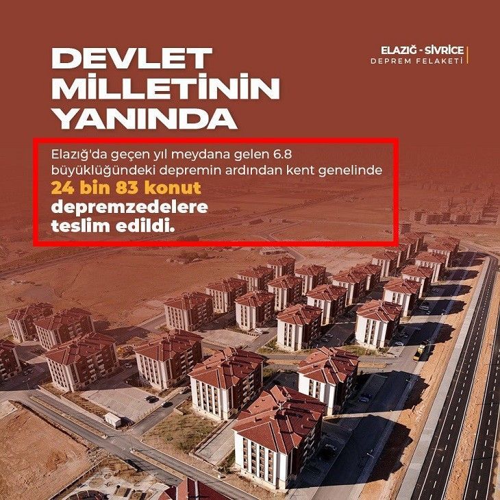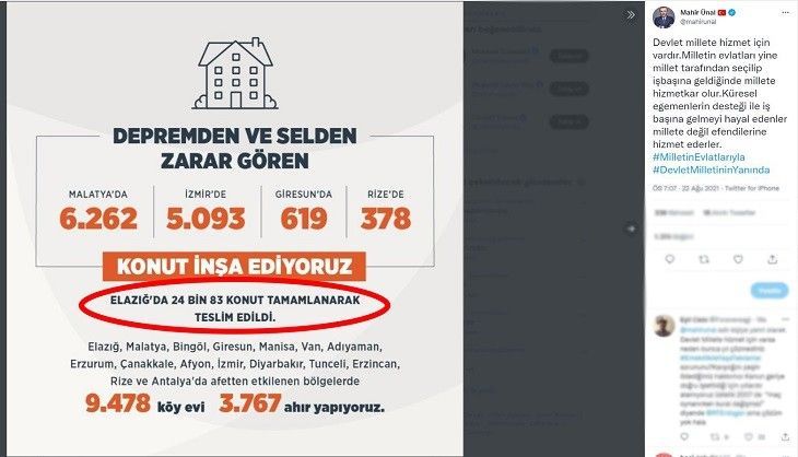 Ak Parti Tanıtım Biriminin 'Devlet Milletinin Yanında' etiketiyle yayınladığı ve Ak Parti üst düzey yöneticilerinin de paylaştığı 'Elazığ'da 24 bin 83 konut tamamlanarak teslim edildi' görseli, tepkilere yol açtı. Yanlış bilgilendirmeyi Elazığ Valisi Erkaya Yırık, '24 bin 83 konuttan 15 bini tamamlandı' diyerek düzeltti.