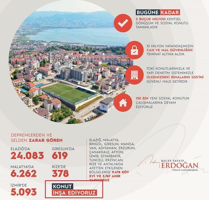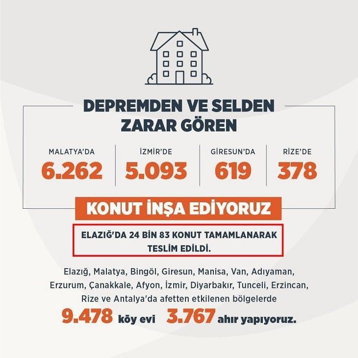 Malatya, İzmir, Giresun ve Rize de inşa edilen konut sayıları verildikten sonra, “Elazığ’da 24 bin 83 konut tamamlanarak teslim edildi” cümlelerine yer verildi.
