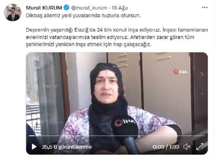 Çevre ve Şehircilik Bakanı Murat Kurum’un 19 Ağustos 2021 tarihinde yaptığı paylaşımda; “Dikbaş ailemiz yeni yuvalarında huzurla otursun. Depremin yaşandığı Elazığ'da 24 bin konut inşa ediyoruz. İnşası tamamlanan evlerimizi vatandaşlarımıza teslim ediyoruz. Afetlerden zarar gören tüm şehirlerimizi yeniden inşa etmek için hep çalışacağız” denmesine rağmen, Ak Parti tanıtım biriminin “24 bin 83 konut tamamlanarak teslim edildi” ifadesi şaşkınlıkla karşılandı.