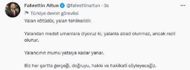 İlimizde TOKİ tarafından yapılan konutlarla ilgili bizzat Ak Parti Genel Merkezi’nin ilgili birimi tarafından kamuoyuna yalan bilgi verilmesinin ardından, Cumhurbaşkanı İletişim Başkanı Fahrettin Altun, Afgan sığınmacı politikasını eleştiren muhalefet için ilginç bir paylaşımda bulunarak yalanın kötü olduğundan söz etti.