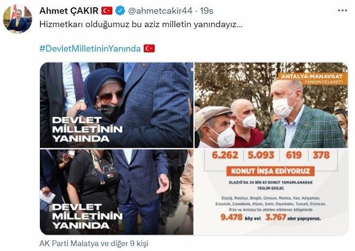 Ak Parti tanıtım birimi tarafından “Devlet Milletinin Yanında” etiketi ile hazırlanan ve afet bölgelerindeki çalışmaların rakamlarla ifade edildiği görsellerde, Cumhurbaşkanı Erdoğan’ın Antalya Manavgat’taki yangın, Kastamonu Bozkurt’taki sel felaketinde, afet bölgesinden vatandaşlarla olan görüntüleri verildi.