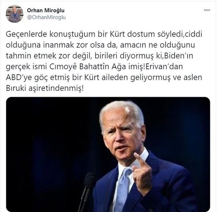 Miroğlu yaptığı paylaşımda: "Geçenlerde konuştuğum bir Kürt dostum söyledi, ciddi olduğuna inanmak zor olsa da, amacın ne olduğunu tahmin etmek zor değil, birileri diyormuş ki, Biden'ın gerçek ismi Cımoyê Bahattîn Ağa imiş! Erivan'dan ABD'ye göç etmiş bir Kürt aileden geliyormuş ve aslen Bıruki aşiretindenmiş!