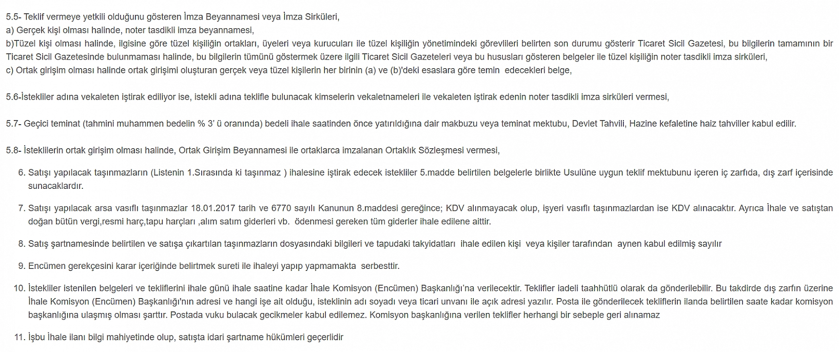 Arsa vasıflı taşınmazlar için 6770 sayılı Kanun’un 8. maddesi uyarınca KDV alınmayacağı; işyeri vasıflı taşınmazlarda ise KDV uygulanacağı açıklandı. İhale ve satıştan doğan vergi, resim, harç, tapu harçları ile tüm alım–satım giderleri ihaleyi kazanan tarafa ait olacak.