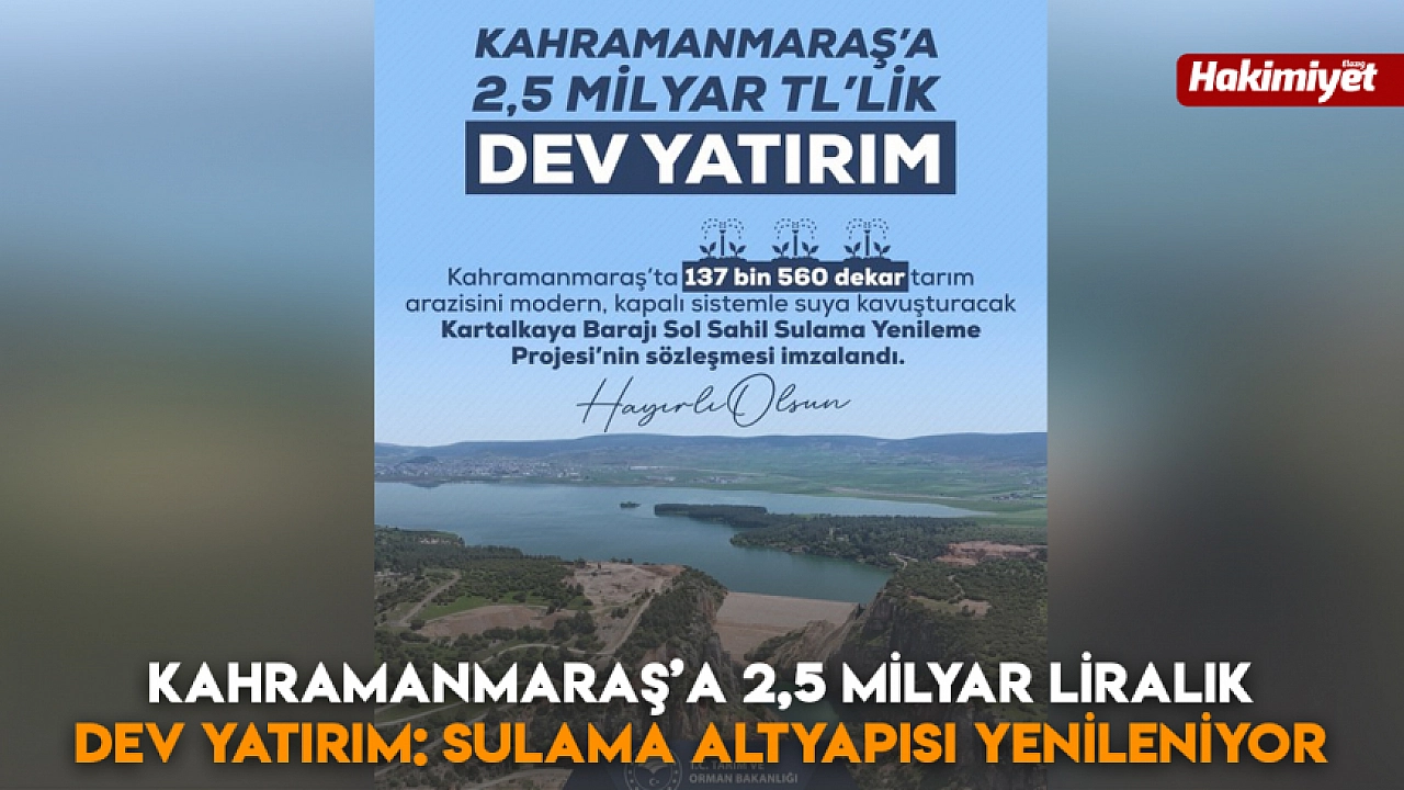 Tarım ve Orman Bakanı İbrahim Yumaklı, Kahramanmaraş'ta sulama altyapısının güçlendirilmesine yönelik 2,5 milyar liralık dev yatırımın hayata geçirildiğini duyurdu. Bakan Yumaklı, sosyal medya hesabından yaptığı açıklamada, 'Kartalkaya Barajı Sol Sahil Sulama Yenileme Projesi' kapsamında imzaların atıldığını belirtti.