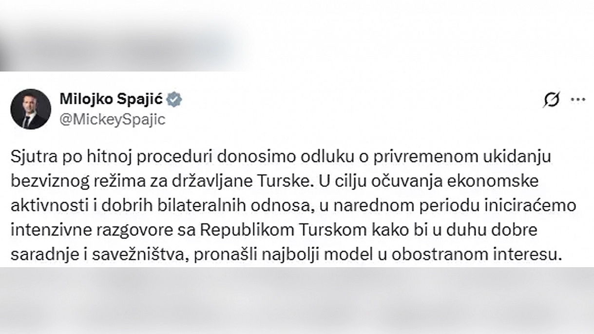 Spajic, X hesabından yaptığı paylaşımda, “Türk vatandaşları için vizesiz seyahat uygulamasının geçici olarak durdurulmasına yönelik kararı acil prosedür kapsamında alacağız. Ekonomik ilişkilerin ve dostane ikili bağların korunması için, Türkiye Cumhuriyeti ile önümüzdeki süreçte yoğun görüşmeler yürüterek, iki tarafın da çıkarına uygun bir model geliştirmeye çalışacağız” ifadelerine yer verdi.