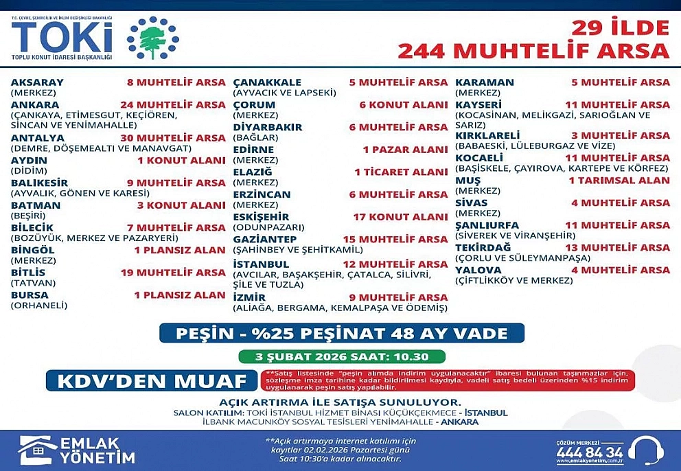 Toplu Konut İdaresi Başkanlığı (TOKİ), 29 ilde yer alan toplam 244 muhtelif arsayı açık artırma yöntemiyle satışa çıkaracak. Konut, ticaret, pazar, tarım ve plansız alan niteliğindeki arsalar için düzenlenecek açık artırma 3 Şubat 2026 Salı günü saat 10.30’da gerçekleştirilecek.