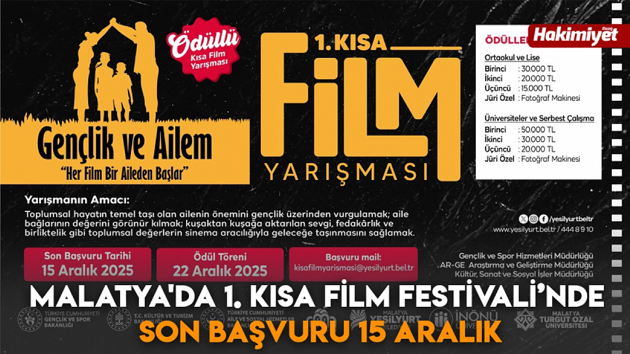 Yeşilyurt Belediyesi, İnönü Üniversitesi ve Turgut Özal Üniversitesi iş birliğinde, '2025 Aile Yılı' etkinlikleri kapsamında düzenlenen ödüllü 1. Kısa Film Yarışması için başvurular devam ediyor. 'Gençlik ve Ailem' konusuyla gerçekleştirilecek yarışmanın son başvuru tarihi 15 Aralık 2025 olarak açıklandı. Ödül töreni ise 22 Aralık'ta düzenlenecek.