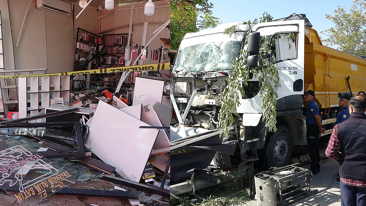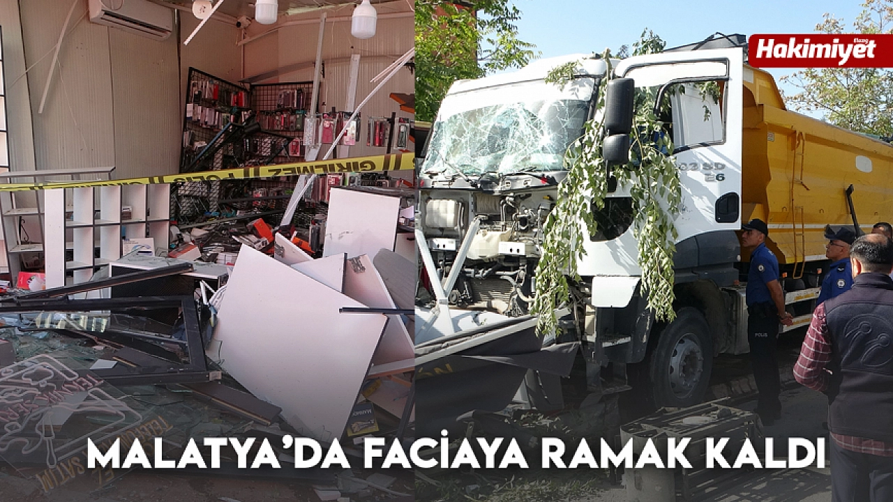 Malatya'da sürücüsünün kontrolünden çıkan hafriyat kamyonu, refüjdeki ağaçlara çarptıktan sonra cadde üzerindeki konteyner iş yerlerine daldı. Kazada facianın eşiğinden dönülürken 4 iş yeri kullanılamaz hale geldi.