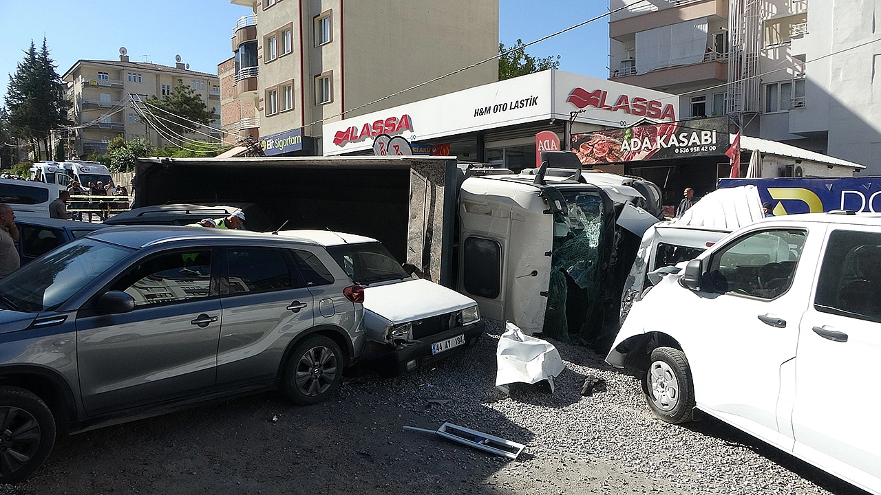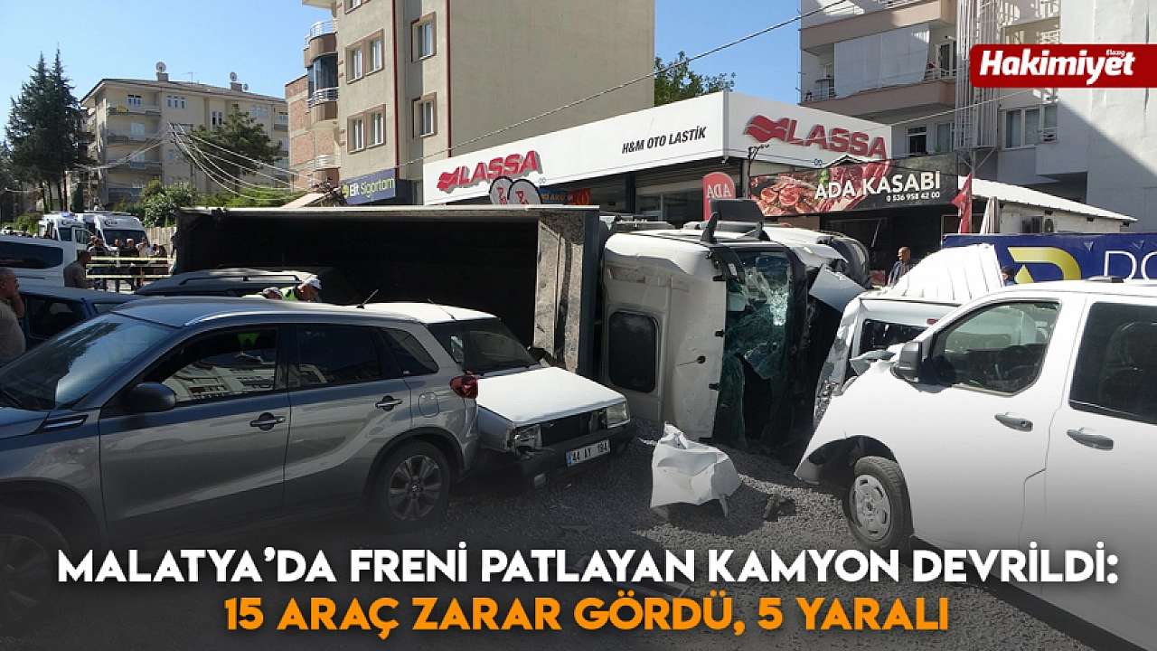 Malatya'da freni patlayan mıcır yüklü bir hafriyat kamyonu, ışıkta bekleyen ve park halindeki araçlara çarptıktan sonra devrilerek yan yattı. Kazada 5 kişi yaralanırken, 15 araçta hasar meydana geldi.