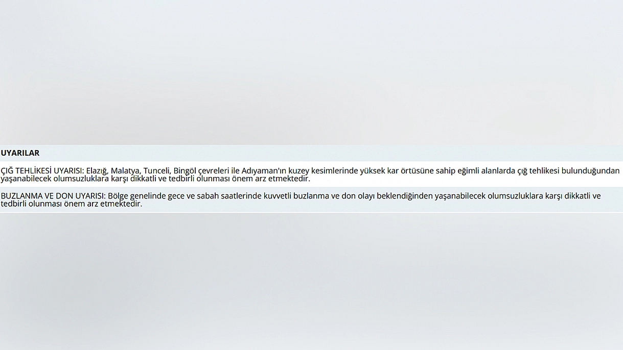 Meteoroloji Genel Müdürlüğü, Elazığ'da yüksek kar örtüsü nedeniyle özellikle eğimli ve kırsal bölgelerde çığ tehlikesi bulunduğunu, gece ve sabah saatlerinde ise kuvvetli buzlanma ve don beklendiğini bildirerek vatandaşları dikkatli ve tedbirli olmaları konusunda uyardı.