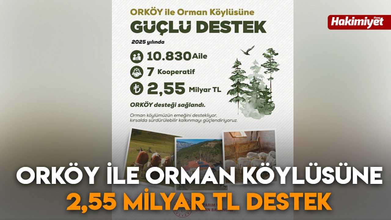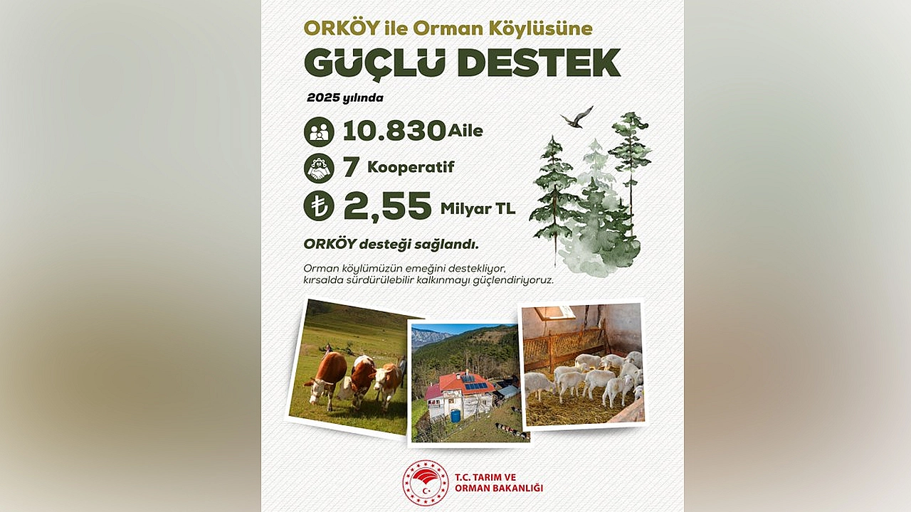 Tarım ve Orman Bakanlığı, ORKÖY (Orman Köylülerini Destekleme) kapsamında 2025 yılı itibarıyla 10.830 orman köylüsü ailesine toplam 2,55 milyar TL destek sağladığını açıkladı.