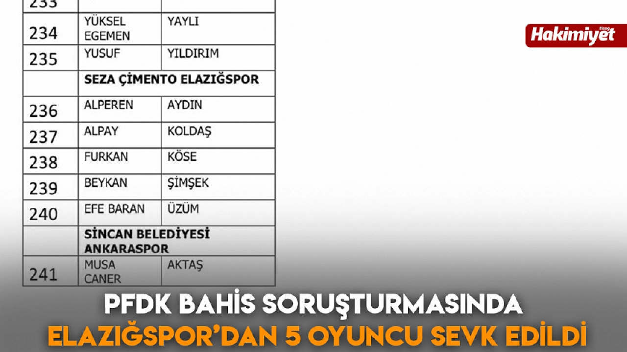 Edinilen bilgilere göre Elazığspor kadrosunda yer alan Beykan Şimşek, Efe Baran Üzüm, Alperen Aydın ve Alpay Koldaş, Furkan Köse yürütülen bahis soruşturması çerçevesinde PFDK’ya sevk edildi.